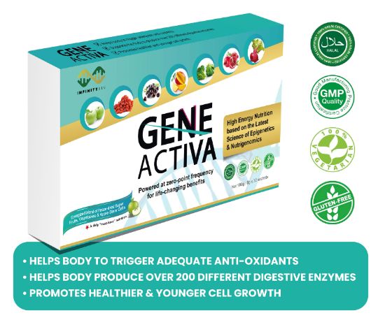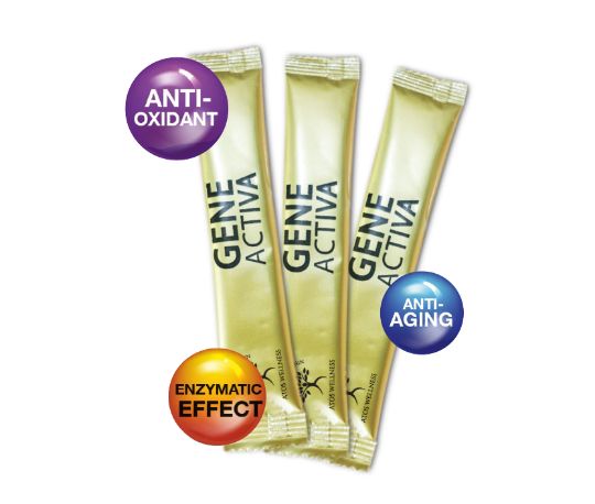GENE ACTIVA High-Energy, Antioxidant, Anti-Aging, Anti-inflammatory nutrition energized with Zeop point energy resonance. It contains pure nutrients blended from 14 antioxidant-rich Super fruits and vegetables such as Broccoli Sprout, Acai berries, Goji berries, Camu Camu, Beetroot, Pomegranate, Wild Rosella, Mango, Noni, Luo Han Guo, Chicory Root, Amalaki, Carrot and Apple Stem Cells which provide a wide variety of secondary antioxidants and phytonutrients.